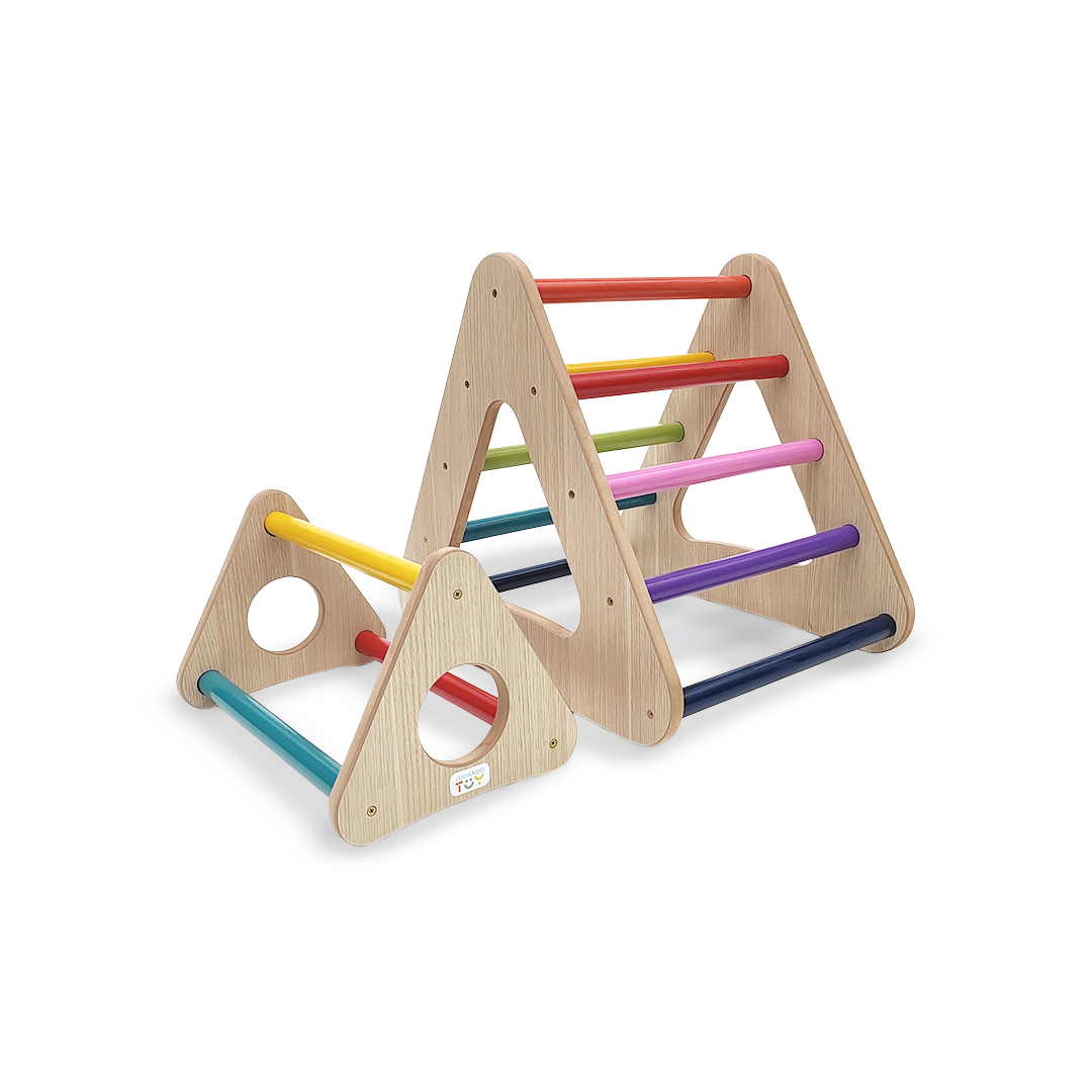 Cuando tu peque adquiera confianza al triángulo, se agarrará a los palos para intentar escalar, subirá algunos peldaños y mirará el mundo desde arriba. Pueden escalar el triángulo hasta arriba, pasar al otro lado y volver a bajar. Incluso intentarán meterse dentro del triángulo para atravesarlo y lanzarán objetos desde dentro o desde fuera, entre las barras. Es perfecto para combinarlo con la rampa escaladora reversible, ya que desde ella dejarán caer pelotas u otros objetos para ver cómo se deslizan. Además, fomentarán la imaginación planteando nuevos retos de cómo escalar desde la rampa, estar en lo más alto y bajar por el triángulo y a la inversa. Con el triángulo pequeño y la rampa, se puede formar una pasarela de equilibrio.